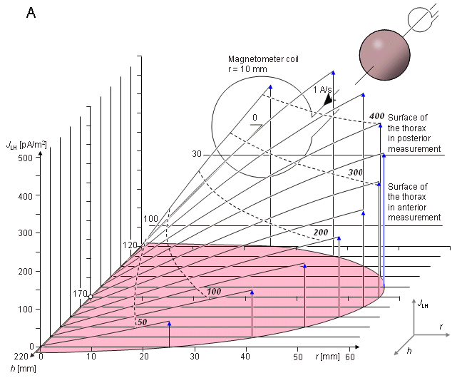 Như đã chú thích trong phần 12.11, trong trường hợp đối xứng trụ, dòng kích trường đạo trình (lead field current) có phương tiếp tuyến, và biên độ của nó độc lập với góc. Do đó, sự phân bố dòng kích trường đạo trình có thể xem như hàm của bán kính hướng tâm r từ trục đối xứng, với khoảng cách h từ từ kế là 1 tham số. Hình 20.14 minh họa sự phân bố độ nhạy bên trong phạm vi 100 mm của mô hình tim. Điều này được chỉ ra với một loạt các đường cong mô tả mật độ dòng kích trường đạo trình, là hàm của khoảng cách (hình 20.14A) và với các đường cong đẳng nhạy (isosensitivity) (hình 20.14B). Hình này cũng chỉ ra vị trí và kích thước của từ kế. Trường hợp đo này phù hợp với phép đo thành phần x của MHV sử dụng hệ thống đạo trình đơn điểm (đơn cực) không đối xứng tại phía trước ngực như đã minh họa trong hình 20.10. Hình 20.15 minh họa thông tin tương tự cho khoảng cách đo là 170 mm. Trường hợp này phù hợp với phép đo đơn cực tại phía sau của ngực.