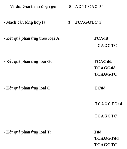 Phương pháp này được F. Sanger và cộng sự phát minh vào năm 1977. Nguyên tắc của phương pháp dideoxy là dựa vào sự tổng hợp mạch bổ sung cho trình tự cần xác định nhờ hoạt động của enzyme DNA-polymerase. Với việc sử dụng thêm các dideoxynucleotide (ddNTP) với các deoxynucleotide (dNTP) thông thường, kết quả tổng hợp cũng là sự hình thành một tập hợp nhiều đoạn DNA có kích thước khác nhau. Trong phản ứng sử dụng đoạn DNA mồi mạch đơn khoảng 20 nucleotide, bốn loại dNTP (trong đó có một loại đánh dấu bằng đồng vị phóng xạ) và bổ xung thêm 1% ddATP (hoặc ddCTP, ddGTP, ddTTP) cho mỗi loại phản ứng. Các ddNTP mất hai nguyên tử oxy ở C3 và C2 khi mạch đơn DNA đang tổng hợp được gắn 1 ddNTP phản ứng ngừng tổng hợp. Mỗi loại phản ứng được thực hiện riêng rẽ, có DNA khuôn, DNA mồi, đầy đủ các loại dNTP, enzyme Taq DNA- polymerase, dung dịch đệm và có thêm khoảng 1% một loại ddNTP. Kết quả phản ứng tổng hợp nên các đoạn oligonucleotide dài ngắn khác nhau một nucleotide và được nhận biết nhờ phương pháp điện di (Hình dưới). Tổng hợp kêt quả phản ứng ở 4 ống, thu được trình tự các nucleotide của mạch đơn, có thể biết được trình tự sắp xếp các nucleotide trong gen.