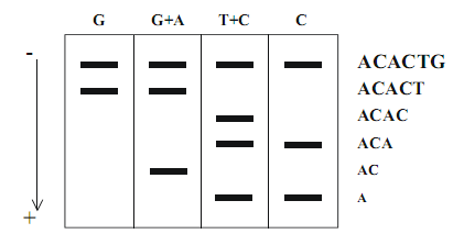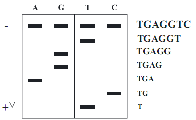 Kết quả: Các phản ứng tạo thành các đoạn DNA cắt ngẫu nhiên, có kích thước khác nhau. Điện di trên gel polyacriamid (Hình 7-5), đọc kết quả điện di bằng máy phóng xạ tự ghi ta thu được trình tự nucleotide của mạch đơn DNA.