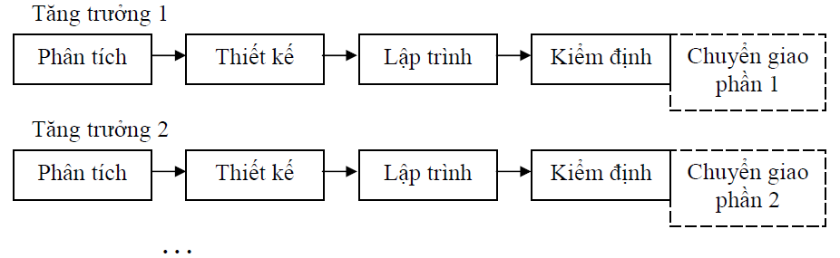 (ii) Chu trình tăng trưởng. Chu trình tăng trưởng, do D. R. Graham đề xuất năm 1989, dựa trên các bước tăng trưởng dần, cho phép hoàn thành hệ thống từng phần một. Mỗi bước tăng trưởng thực hiện một tiến trình tuyến tính gồm các bước phân tích, thiết kế, lập trình, kiểm định và chuyển giao từng phần (Hình 2). Quá trình này lặp lại nhiều lần cho đến khi có được phương án hoàn chỉnh cho cả hệ thống.