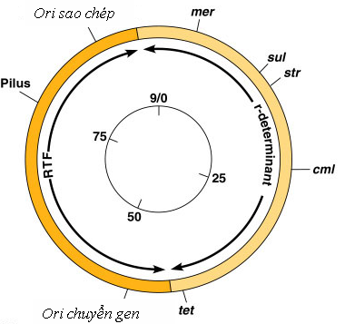 Một plasmid R có thể mang nhiều gen đề kháng. Chẳng hạn, plasmid R100 có 94,3 kbp (hình 20.25), mang những gen mã hóa cho sự kháng sulfonamid, streptomycin và spectinomycin, fusidic axit, chloramphenicol, tetracylin và có thể một số gen kháng thủy ngân (mercury). Plasmid R100 có thể được chuyển giữa các vi khuẩn đường ruột thuộc chi (Genra) Escherichia, Klebsiella, Proteus, Salmonella và Shigella, có thể chuyển vào vi khuẩn Gram âm Pseudomonas. Những plasmid R khác có gen kháng kháng sinh cũng được ghi nhận.