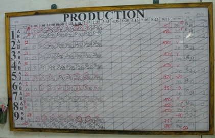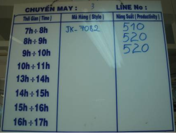 - After every hour, line managers fill in the hour productivity figure of each production line on each cells of the Production Scheduling board, besides each target figure.