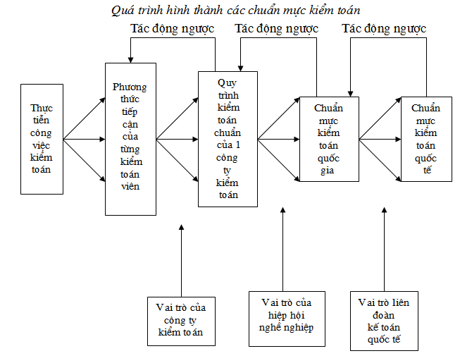 - Thứ hai đó là quá trình tác động ngược lại của các chuẩn mực được hình thành. Khi một cồn ty kiểm toán xây dựng được quy trình kiểm toán chuẩn của mình, các kiểm toán nên có trách nhiệm đIều chỉnh lại phương thức tiếp cận của mình phù hợp với những quy định chung trong quy trình kiểm toán chuẩn của công ty. Các chuẩn mực kiểm toán quốc gia khi hình thành cũng tác động ngược lại quy trình kiểm toán chuẩn của các công ty kiểm toán theo hướng tương tự và cuối cùng sự ra đời của chuẩn mực kiểm toán quốc tế cũng có những ảnh hưởng nhất định đến chuẩn mực kiểm toán của các quốc gia.