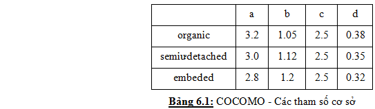 Trong đó a,b,c,d là các tham số tùy thuộc vào từng loại dự án (xem bảng 6.1). Điểm đáng chú ý ở đây là từ nỗ lực phát triển chúng ta suy ra thời gian và số người tham gia vào dự án.
