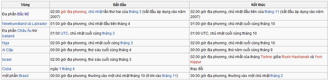 Bảng dưới đây cho biết lúc bắt đầu và kết thúc của việc chỉnh giờ mùa hè ở một số vùng lãnh thổ. Các đồng hồ được vặn sớm lên một tiếng đồng hồ vào ngày bắt đầu và lùi lại từng này thời gian vào ngày kết thúc. Chú ý, mùa hè ở Nam Bán Cầu tương ứng với mùa đông ở Bắc Bán Cầu.