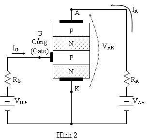 Nếu ta mắc một nguồn điện một chiều VAA vào SCR như hình sau. một dòng điện nhỏ IG kích vào cực cổng G sẽ làm nối PN giữa cực cổng G và catot K dẫn phát khởi dòng điện anod IA qua SCR lớn hơn nhiều. Nếu ta đổi chiều nguồn VAA (cực dương nối với catod, cục âm nối với anod) sẽ không có dòng điện qua SCR cho dù có dòng điện kích IG. Như vậy ta có thể hiểu SCR như một diode nhưng có thêm cực cổng G và để SCR dẫn điện phải có dòng điện kích IG vào cực cổng.