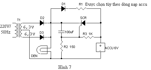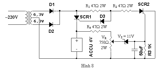 - Khi accu nạp chưa đầy, SCR1 dẫn, SCR2 ngưng