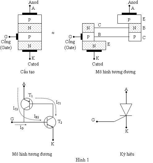 Ta thấy SCR có thể coi như tương đương với hai transistor PNP và NPN liên kết nhau qua ngõ nền và thu