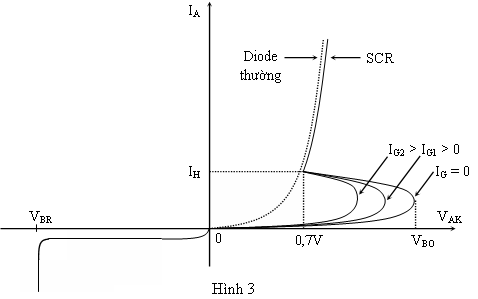 - Khi SCR được phân cực thuận (điện thế anod dương hơn điện thế catod), nếu ta nối tắt (hoặc để hở) nguồn VGG (IG=0), khi VAK còn nhỏ, chỉ có một dòng điện rất nhỏ chạy qua SCR (trong thực tế người ta xem như SCR không dẫn điện), nhưng khi VAK đạt đền một trị số nào đó (tùy thuộc vào từng SCR) gọi là điện thế quay về VBO thì điện thế VAK tự động sụt xuống khoảng 0,7V như diode thường. Dòng điện tương ứng bây giờ chính là dòng điện duy trì IH. Từ bây giờ, SCR chuyển sang trạng thái dẫn điện và có đặc tuyến gần giống như diode thường.
