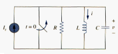 Consider the parallel RLC circuit shown in [link]. We want to find i due to a sudden application of a dc current. Applying KCL at the top node for t > 0,