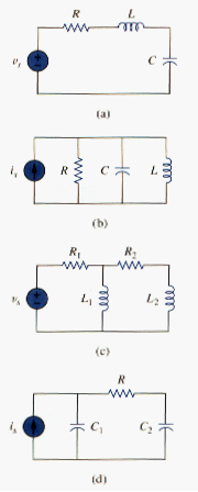Typical examples of second-order circuits are RLC circuits, in which the three kinds of passive elements are present. Examples of such circuits are shown in [link](a) and [link](b). Other examples are RC and RL circuits, as shown in [link](c) and [link](d). It is apparent from [link] that a second-order circuit may have two storage elements of different type or the same type (provided elements of the same type cannot be represented by an equivalent single element). An op amp circuit with two storage elements may also be a second-order circuit. As with first-order circuits, a second-order circuit may contain several resistors and dependent and independent sources.