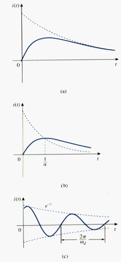 With the presence of sine and cosine functions, it is clear that the natural response for this case is exponentially damped and oscillatory in nature. The response has a time constant of and a period of . [link](c) depicts a typical underdamped response. [link] assumes for each case that i(0) = 0.