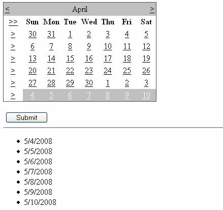 | SelectionMode | Cho phép chỉ định các ngày được lựa chọn có giá trị như thế nào, nó có thể là các giá trị sau: Day, DayWeek, DayWeekMonth, và none. |