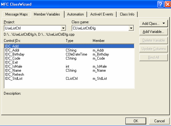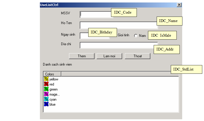 voidCUseListCtrlDlg::InsertStudent(CStringCode,CStringName, COleDateTime Birthday, BOOL IsMale, CString Addr) { static unsigned int index = 0; CString Temp; // Chèn thêm một record ở dòng thứ index m_StdList.InsertItem(index,Code); // Ghi dữ liệu vào cột thứ 0 với nội dung trong biến Code ở dòng thứ index m_StdList.SetItemText(index,0,Code); m_StdList.SetItemText(index,1,Name); Temp.Format("%d/%d/%d",Birthday.GetDay(),Birthday.GetMonth(),Birth day.GetYear()); m_StdList.SetItemText(index,2,Temp); Temp = (IsMale==0)?"Nam":"Nu"; m_StdList.SetItemText(index,3,Temp); m_StdList.SetItemText(index,4,Addr); index++; } - Trong hàm OnAdd(), ta thêm đoạn code sau:
