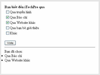 Code 9.10 Trong code 9.10 có sử dụng hàm fillCheckBoxList là phương thức của lớp ListControlHelper(xem cuối chương) để đưa dữ liệu vào CheckBoxList, trong hàm btnVote_Click được thực hiện khi bạn nhấn vào nút Vote trên trang, phương thức này sẽ duyệt từ Item đầu đến hết trong CheckBoxList và kiểm tra nếu Item đó được chọn thì chúng ta sẽ lấy giá trị
