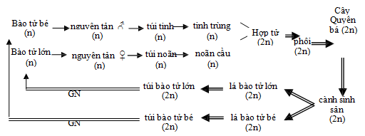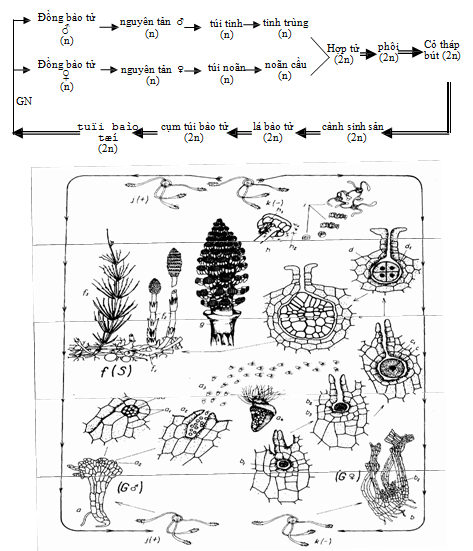 a. Thể giao t ử đực; a2. Bào tử bé nẩy mầm; a3. Sự hình thành túi tinh; a4. Nhóm tế bào nguyên giao tử; a5,. Tế bào mẹ của tinh trùng; a6 tinh trùng đã ttrưởng thành; msp. Túi bào tử bé; b. Thể giao tử cái; MSP. túi bào tử lớn; Ma. Bào tử lớn; msp. túi bào tử bé; mi. Bào tử bé; Mf. Lá bào tử lớn; mf. Lá bào tử bé; f. Chuỗi lá bào tử; b2. Thể giao tử cái với hai nhân; b3. Thể giao tử cái với các túi noãn đang hình thành ở cực trên (P); c. Thể giao tử cái với phôi (c); c1. Phôi vẽ phóng đại; t. Chân phôi; s. Dây treo; gy. Rễ mầm; h. Chồi mầm; FS. Thể bào tử ở thời kỳ phi; S. Thể băo tử ở giatrưởng thành. gyt. Cành trong đất; e. Cành sinh sản với chuỗi lá bào tử.