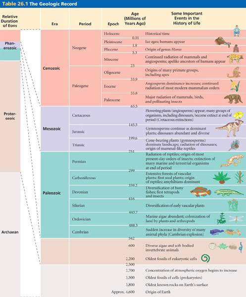 Căn cứ vào cứ vào tuổi của đá và các hoá thạch, người ta chia sự sống thành 5 đại: đại thái cổ, nguyên sinh, cổ sinh, trung sinh, tân sinh. Hình bên dưới mô tả cơ thể sống từ dạng ban đầu sớm nhất và thới gian tương ứng với các đại địa chất từ tiền Cambri.