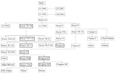 - Sever: Đây là tiền đề của Soyuz. Nó là thiết kế đầu tiên của OKB-1 về một tàu vũ trụ có người lái thay thế Vostok. Sever cũng có hình dạng kiểu “đèn pha ôtô” như khoang hạ cánh của Soyuz sau này nhưng nó lớn hơn 50%.
