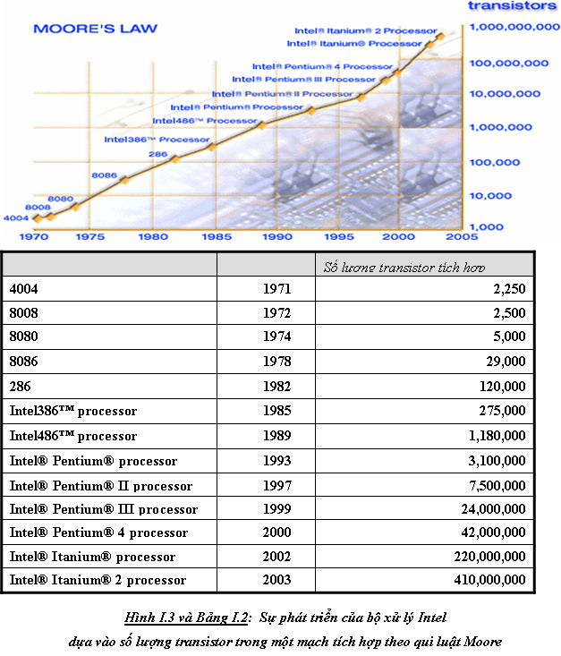 Từ năm 1965, Gordon Moore (đồng sáng lập công ty Intel) quan sát và nhận thấy số transistor trong mỗi mạch tích hợp có thể tăng gấp đôi sau mỗi năm, G. Moore đã đưa ra dự đoán: Khả năng của máy tính sẽ tăng lên gấp đôi sau 18 tháng với giá thành là như nhau.