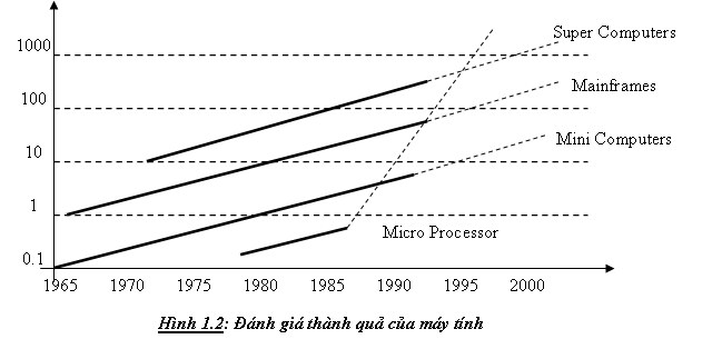 Hình I-2 cho thấy diễn biến của thành quả tối đa của máy tính. Thành quả này tăng theo hàm số mũ, độ tăng trưởng các máy vi tính là 35% mỗi năm, còn đối với các loại máy khác, độ tăng trưởng là 20% mỗi năm. Điều này cho thấy tính năng các máy vi tính đã vượt qua các loại máy tính khác vào đầu thập niên 90 .