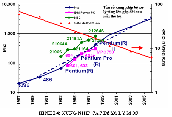 Hình I.4 cho thấy sự tăng trưởng về tần số xung nhịp của các bộ xử lý MOS. Độ tăng trưởng của tần số xung nhịp bộ xử lý tăng gấp đôi sau mỗi thế hệ và độ trì hoãn trên mỗi cổng / xung nhịp giảm 25% cho mỗi năm .