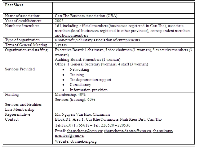 - By providing high-quality training to members, CBA meets the common capacity building needs of businesses in Can Tho. Before CBA, VCCI Can Tho was the only place in Can Tho to provide short training course to businesses. In that sense, CBA acts as a common organizer to determine the need, find the providers and organize courses. The association has since decided to focus mainly on training to ensure that resources are focused where they make the most difference.