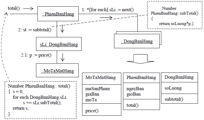 Sau khi gán total() cho lớp PhienBanHang thì lại phải biết thêm là ai cung cấp những mục con (số tiền bán từng mặt hàng). Thông tin này được xác định thông qua hàm subtotal(). Vì vậy, :PhienBanHang phải gửi tiếp thông điệp subtotal() cho từng : DongBanHang như hình 3.