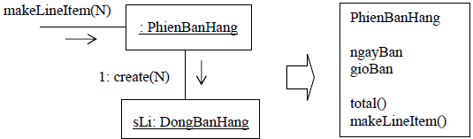 Một :PhienBanHang chứa (thực chất là bao gồm) nhiều đối tượng :DongBanHang, do vậy theo mẫu này thì có thể gán trách nhiệm PhienBanHangđể tạo lập các đối tượng của DongBanHang. Trách nhiệm này được gán khi có yêu cầu cần tạo ra một dòng bán hàng với Nđơn vị, nghĩa là khi :PhienBanHang nhận được thông điệp makeLineItem(N)thì nó sẽ gửi cho :DongBanHang thông điệp create(N)như hình 7.