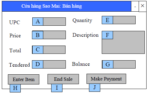 6. Khách hàng đưa một số tiền để trả tiền mua hàng, người nhập số đó vào ô D và ấn J (nút Make Payment), số đó thường lớn hơn total. | 7. Hệ thống xác định số tiền trả lại cho khách và hiển thị ở ô G. |