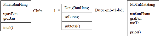 Để biết và tính được subtotal() thì :DongBanHang phải biết thông tin về giá bán được lấy từ đâu. Như hình 6-11 thì subtotal() được xác định từ :DongBanHang và là tích của DongBanHang.soluong * MoTaMatHang.giaBan, do vậy biểu đồ cộng tác của hoạt động tính total() sẽ được xây dựng như hình 4.