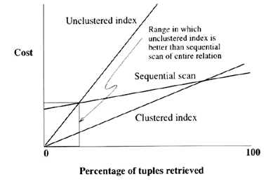 Chúng ta minh hoạ mối quan hệ giữa số lượng các bộ giá trị truy cập biểu diễn bằng tỷ lệ so với tổng số bộ giá trị có trong quan hệ, và giá của các phương pháp truy cập khác nhau trong Hình 2. Để đơn giản, chúng ta giả sử rằng truy vấn này là một phép chọn trên chỉ một quan hệ. (Hình này phản ánh giá của việc viết ra kết quả; và đường của quét tuần tự là một mặt phẳng.)