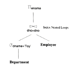 Chúng ta đã kết luận rằng một kế hoạch tốt để thực hiện truy vấn này là sử dụng một chỉ mục trên dname để truy cập các bộ giá trị trong Departments thoả mãn điều kiện trên dname và tìm những bộ giá trị tương ứng của Employees sử dụng chỉ mục trên dno.