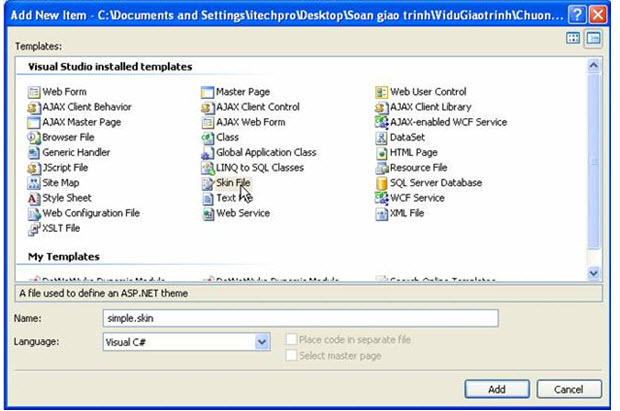 - hộp thoại Add New Item hiện ra bạn chọn Skin File và đặt tên Skin của mình vào hộp Name và nhấn vào nút Add như hình sau: