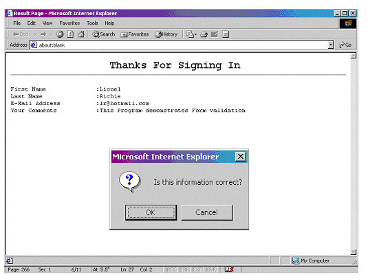 Khi người dùng click vào nút “Submit This Form”, Nội dung hợp lệ sẽ được hiển thị trong cửa sổ mới như hình bên dưới. Tương tụ, khi click vào nút “Reset This Form”, nội dung trong form sẽ bị xoá.
