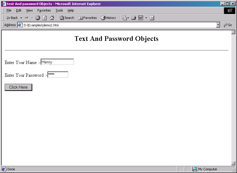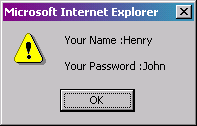 Khi người dùng nhấn vào nút Click Here, nó sẽ hiển thị một hộp thông báo chứa tên và password mà người dùng đã nhập vào như hình bên dưới: