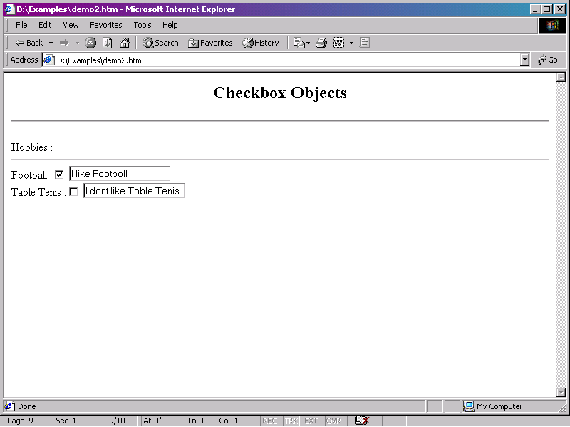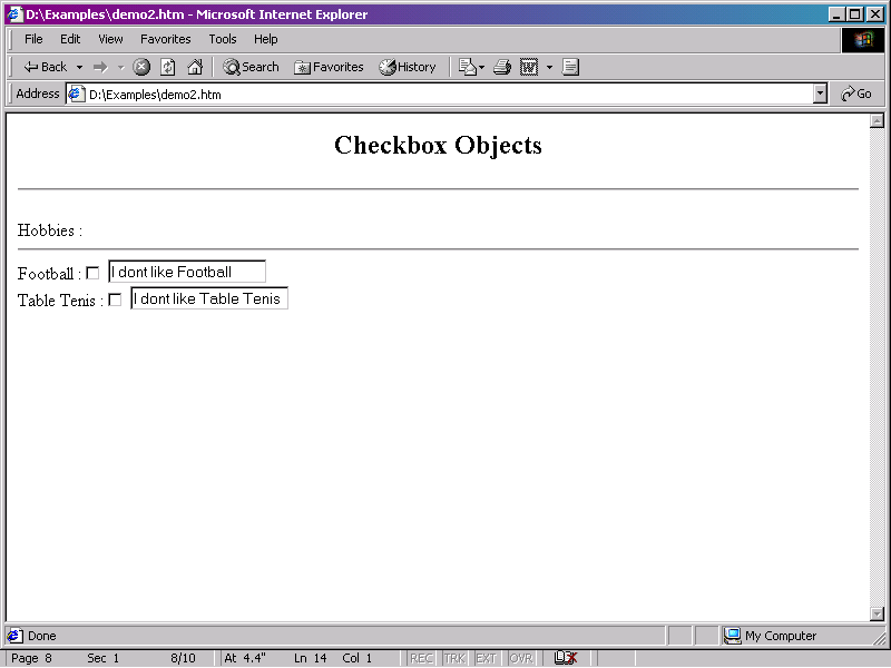 Hobbies :-<INPUT TYPE="CHECKBOX" NAME="check1" VALUE="Reading" CHECKED>Reading