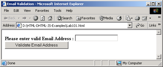 <HTML> <HEAD> <TITLE> Email Validation </TITLE> <script language="JavaScript"> <!-- function IsEmailValid(FormName,ElemName) { var EmailOk = true var Temp = ElemName var AtSym = Temp.value.indexOf('@') var Period = Temp.value.lastIndexOf('.') var Space = Temp.value.indexOf(' ') var Length = Temp.value.length - 1 // Array is from 0 to length-1 if ((AtSym < 1) || // '@' cannot be in first position (Period <= AtSym+1) || // Must be atleast one valid char btwn '@' and '.' (Period == Length ) || // Must be atleast one valid char after '.' (Space != -1)) // No empty spaces permitted { EmailOk = false alert('Please enter a valid e-mail address!') Temp.focus() } return EmailOk } // --> </script> </HEAD> <BODY BGCOLOR="#FFFFFF"> <form name="frm"> <b>Please enter valid Email Address : <INPUT TYPE="text" NAME="text1"> <INPUT TYPE="button" value="Validate Email Address" onClick="IsEmailValid('frm',frm.text1);"> </form> </BODY> </HTML>