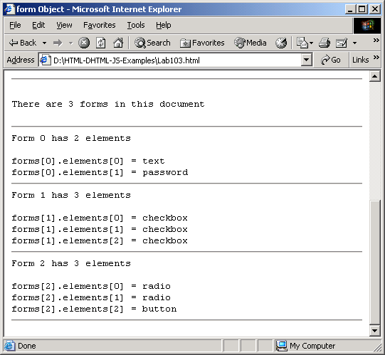 document.write("forms["+i+"].elements[" + j + "] = " + document.forms[i].elements[j].type+"\n")