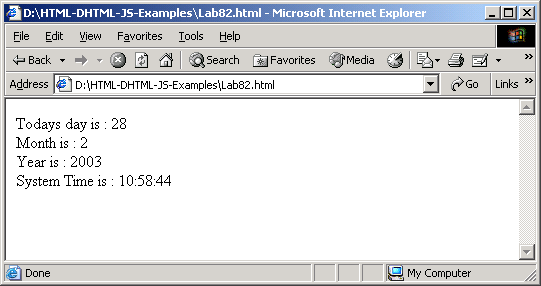 <HTML> <BODY bgColor = white> <SCRIPT LANGUAGE = "JavaScript"> mydate=new Date(); document.write("Todays day is: "+ mydate.getDate()); document.write("<BR>"); document.write("Month is: "+ (mydate.getMonth()+1)); document.write("<BR>"); document.write("Year is: "+ mydate.getYear()); document.write("<BR>"); document.write("System Time is: "); document.write(mydate.getHours()+":"+mydate.getMinutes()+":"+mydate.getSeconds()); </SCRIPT> </BODY> </HTML>