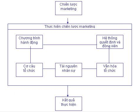 Vậy thì, một Công ty muốn thành công thì trước hết phải thiết kế một chiến lược hay, năng động để đạt được các mục tiêu của mình. Thế rồi, Công ty phải thiết lập được một cấu trúc tổ chức hợp lý với các hệ thống thông tin, hoạch định, điều hành và tưởng thưởng tốt để thực hiện chiến lược này. Các nhà tư vấn của hãng McKinsey cho rằng trong những thập niên gần đây, giới quản trị đã quá thiên về các yếu tố phân tích cứng nhắc và xa rời với những yếu tố quan trọng liên quan đến con người. Sức mạnh của Công ty vượt quá chuyện chiến lược, cấu trúc và hệ thống. Sự thành công của Công ty còn tùy thuộc vào việc có được những con người đúng (nhân sự) làm việc đúng (kỹ năng) trong một bầu không khí tổ chức và quản trị tốt (phong cách và các giá trị được thừa nhận). Tiến trình thực hiện chiến lược marketing trình bày trong [link].