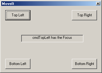 Ta thử viết chương trình Movelt dùng để di chuyển cửa sổ. Movelt có một cửa sổ tên là frmMove, chứa 4 nút lệnh ở 4 góc màn hình. khi thi hnàh nhấn vào moọt trong các nút này sẽ làm cửa sổ di chuyển tới góc màn hình tương ứng. giữa màn hình sẽ là một nhãn hiệu sẽ thông báo tức thời các di chuyển của chuột cũng như nút lệnh nào được Focus. Các bước tổng quát dể tạo Movelt:
