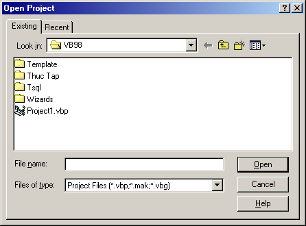 Ta có một số đề án đang làm việc. Khởi động Visual Basic, chọn menu File. Phần dưới menu liệt kê danh sách các đề án mới nhất mà ta đã làm việc, chọn đề án cần mở. nếu đề án không xuất hiện trong danh sách, ta phải chỉ ra đường dẫn.