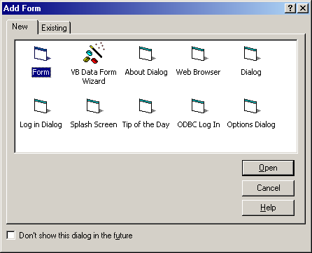 Lần đầu khởi động Visual Basic, hộp thoại New project xuất hiện. ta có thể chọn mở đề án mới nhất hoặc có sẵn trên đĩa ngay từ hộp thoại này. nếu không muốn hộp thoại này xuất hiện mỗi lần khởi động Visual Basic, xoá đánh dáu trên hộp đánh dấu (checkbox) nằm ở bên dưới hộp thoại.