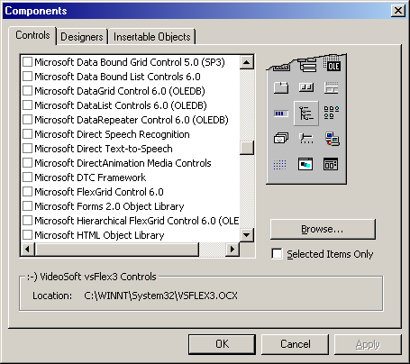 - Để thêm một điều khiển (.ocx) hoặc thêm một đối tượng nhúng vào hộp công cụ, chọn vào hộp đánh dấu bên trái tên điều khiển