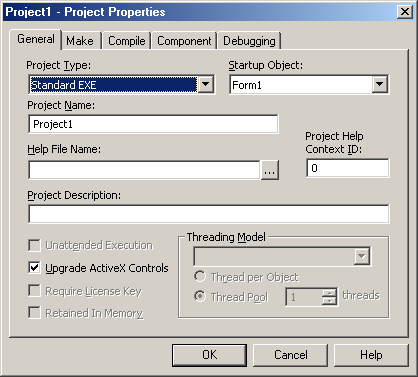 Từ menu Project, chọn <tên đề án > Properties. Hộp thoại Project Properties xuất hiện. những sửa đổi trên hộp thoại này sẽ được lưu trên tệp tin.vbp