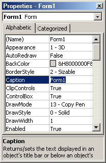 Thuộc tính Caption được đánh dấu, nghĩa là ta có thể sửa đổi thuộc tính này.