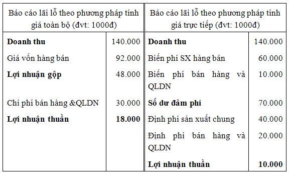 Có thể thấy việc trình bày báo cáo lãi lỗ theo bộ phận vẫn dựa trên cách ứng xử chi phí. Điểm khác biệt là cách nhìn nhận về định phí chung. Định phí này sẽ không phân bổ cho bất kỳ hoạt động nào để xác định lợi nhuận của từng bộ phận mà quan trọng hơn là lợi nhuận của từng bộ phận (số dư bộ phận) là âm hay dương. Nếu số dư của một bộ phận là âm thì việc duy trì hoạt động sản xuất của bộ phận đó sẽ ảnh hưởng đến khả năng tích lũy chung của doanh nghiệp. Ngược lại, đơn vị cần duy trì hoạt động có số dư bộ phận dương để góp phần bù đắp phần định phí chung toàn doanh nghiệp.