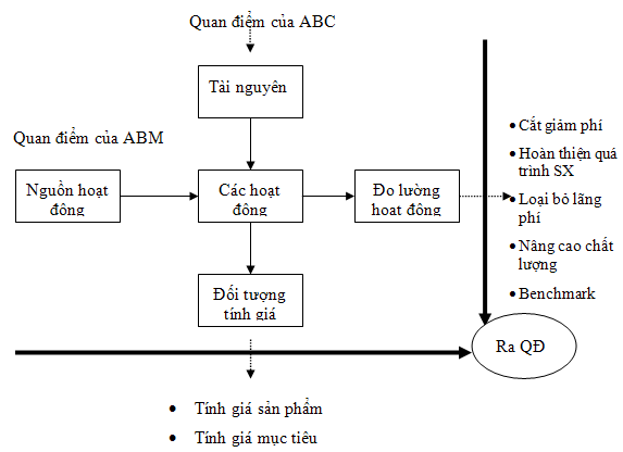 Để khắc phục những hạn chế đó, người ta bắt đầu nghiên cứu và ứng dụng một phương pháp tính giá thành sản phẩm mới gọi là phương pháp tính giá thành dựa trên cơ sở hoạt động (ABC). Khởi đầu từ ý tưởng của các nhà quản trị vào đầu những năm 1980, phương pháp ABC chỉ là một kỹ thuật tính giá thành sản phẩm, dịch vụ bằng cách áp dụng nhiều tiêu thức phân bổ đối với chi phí sản xuất chung để đảm bảo giá thành xác định hợp lý hơn. Đến đầu những năm 1990, các nhà quản trị phát hiện rằng, với cùng một dữ liệu ban đầu nhưng giá thành tính theo phương pháp ABC được sử dụng tốt hơn cho việc thiết kế sản phẩm và thiết kế lại quá trình sản xuất. ABC còn được sử dụng để đo lường hiệu quả hoạt động của quá trình kinh doanh. Số liệu của phương pháp ABC giúp các nhà quản trị nhìn nhận rõ hơn mối quan hệ giữa thời gian, chất lượng, công suất nhà xưởng, sự linh họat và chi phí của doanh nghiệp. Phương pháp ABC ngày nay đã gắn với một triết lý mới trong quản trị là quản trị dựa trên hoạt đông (ABM). Mối quan hệ giưa ABC và ABM thể hiện qua sơ đồ 3.4.