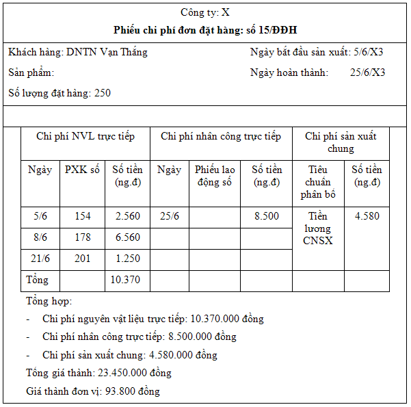 Toàn bộ chi phí tham gia vào sản xuất sản phẩm được tập hợp trên phiếu chi phí công việc vào cuối thàng. Nếu cuối tháng, công việc vẫn chưa hoàn thành thì toàn bộ chi phí tập hợp trên phiếu chi phí sẽ là giá trị sản phẩm dở dang. Khi đơn đặt hàng hoàn thành, toàn bộ chi phí tập hợp trên phiếu là tổng giá thành. Gía thành đơn vị sản phẩm được xác định như sau: