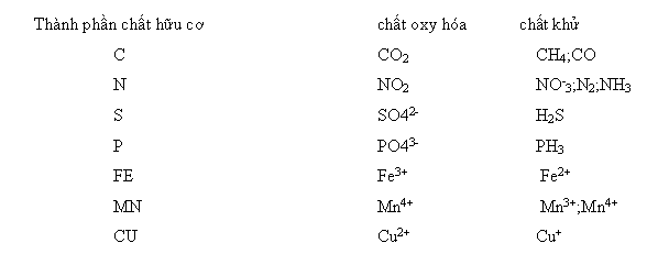 Trong đất những chất oxy hóa là O2; NO3-; Fe3+; Mn4+; Cu2+ và một số sinh vật hiếu khí. Chất khử là H2, Fe2+, Cu+ và vi sinh vật kị khí.